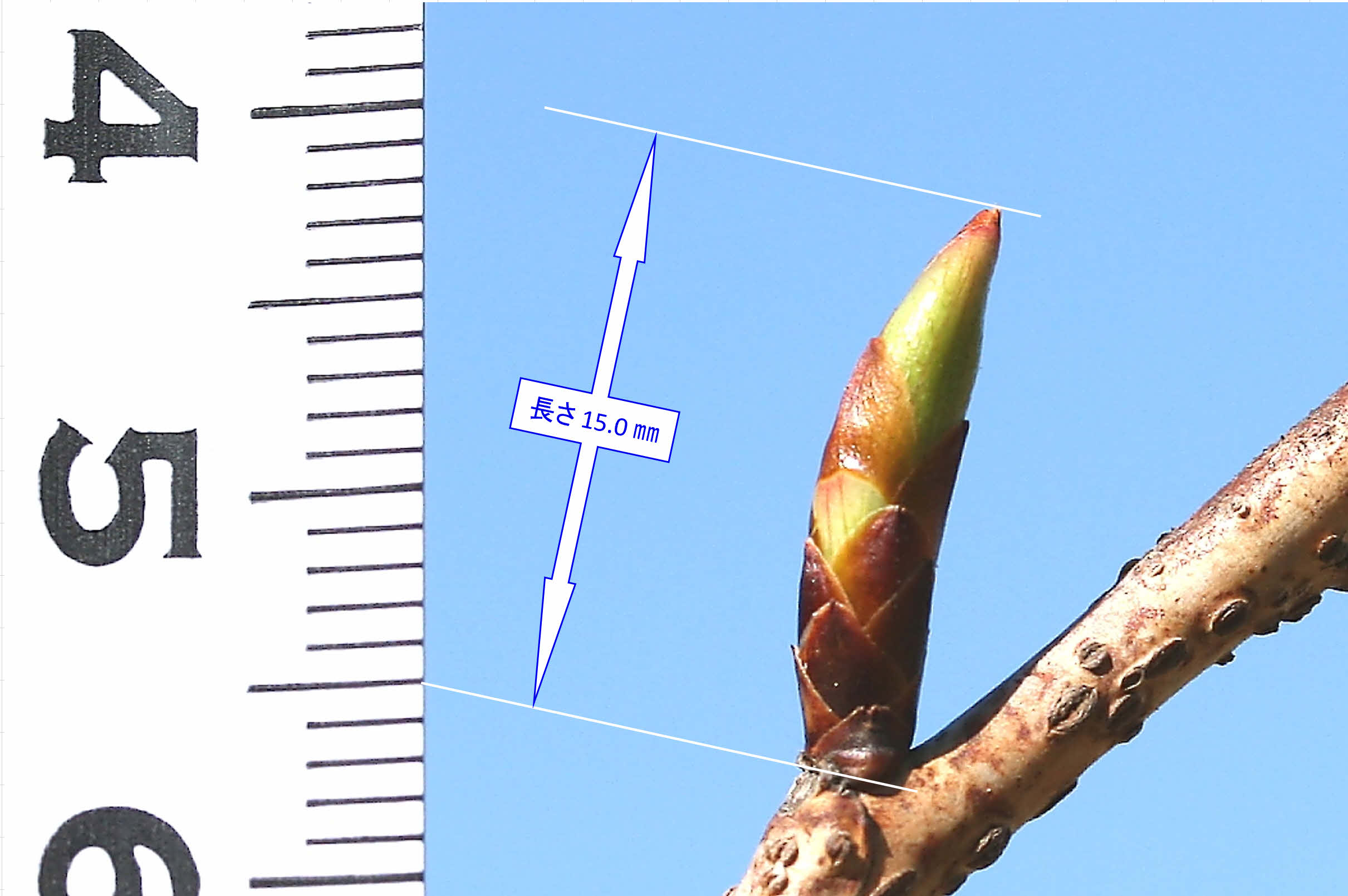 MEMO: 膨らみ始めた山桜の冬芽で、円錐形で長さ 15.0 ㎜と非常に 長い品種で、山桜は花より先に葉が出てくるので、この芽は葉芽である