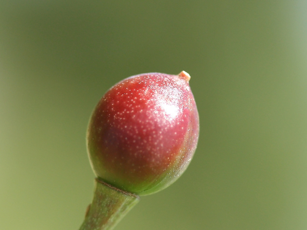 MEMO: 結実した楊貴妃の実で、色が赤実を帯びており、熟し 始めたと思われるが、この先、どこまで熟すかが楽しみである