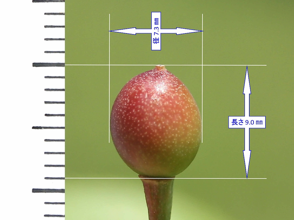 MEMO: 結実した楊貴妃の実の大きさで、長さ 9.0 ㎜で、直径も 7.3 ㎜と順調に大きくなり、この先、どこまで熟すかが楽しみである