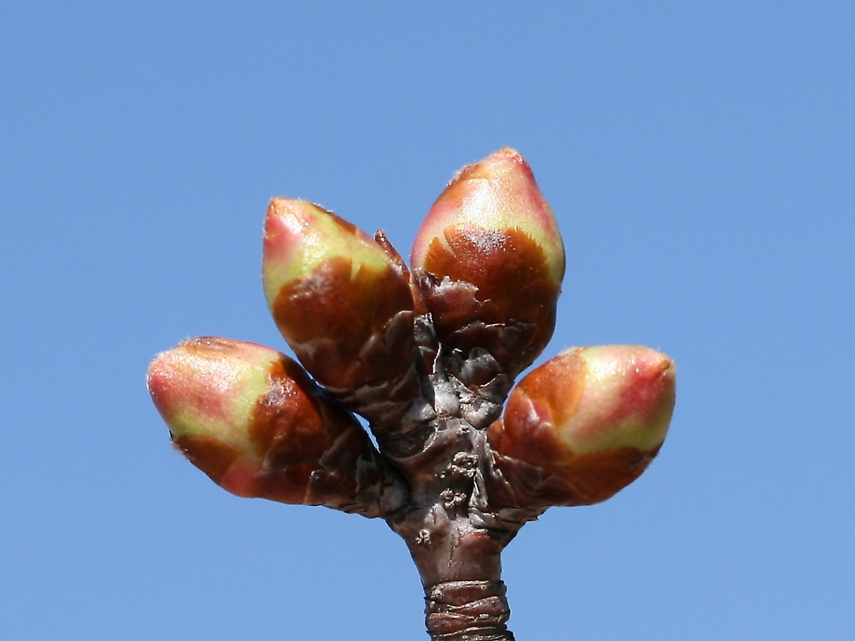 MEMO: 陽光の冬芽で膨らみが増し、丸みも更に増し、先端 の淡紅色や淡黄緑色もはっきりとしてきたところで、芽の形から この芽は、4個とも花芽であり、咲いた時が楽しみな花芽である