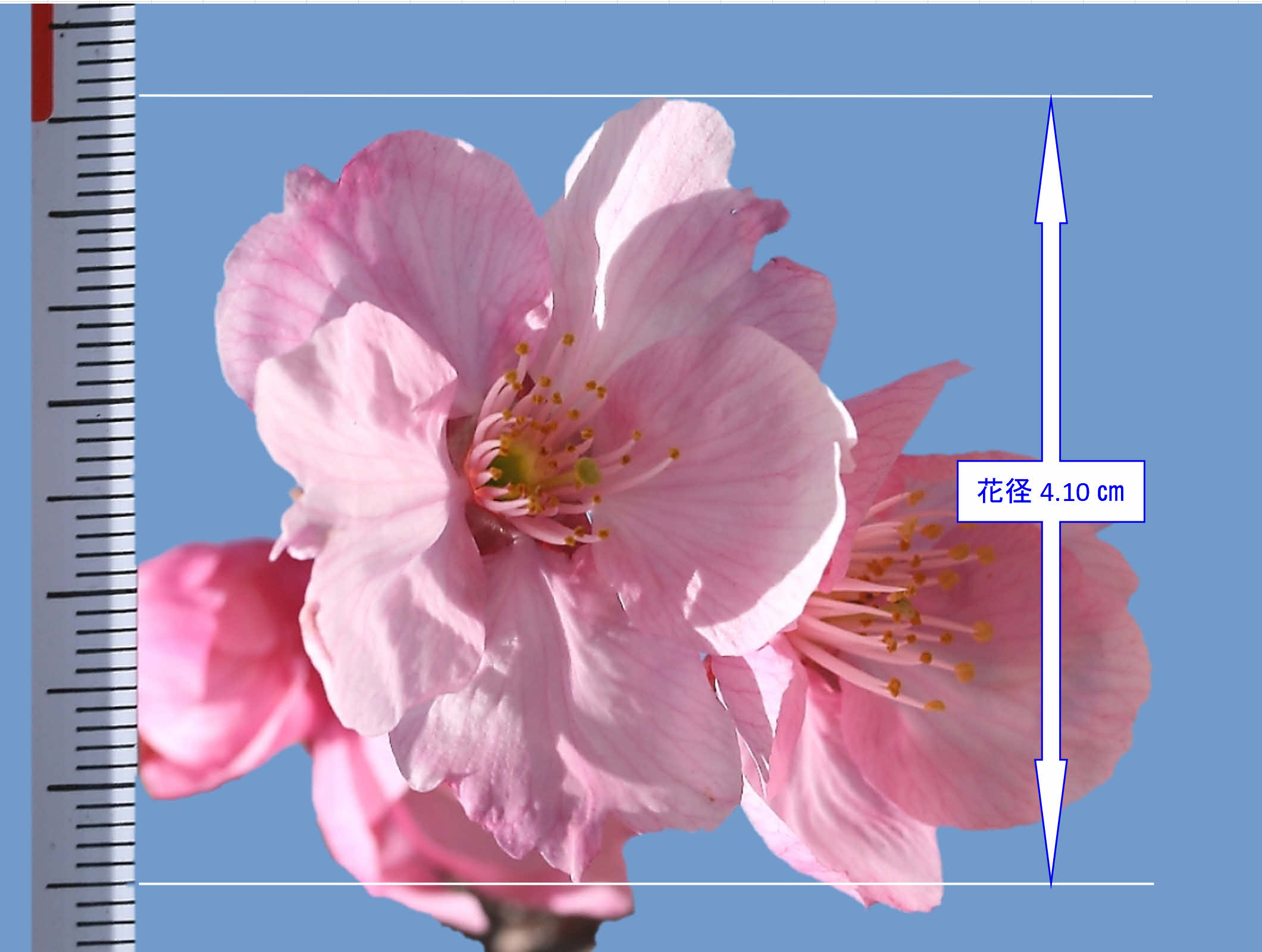 MEMO: 開花したばかりの陽光の直径で、4.1 ㎝の大輪で濃いめ の淡紅色の花弁に紅色の脈が入り、少し波打つのが特徴である