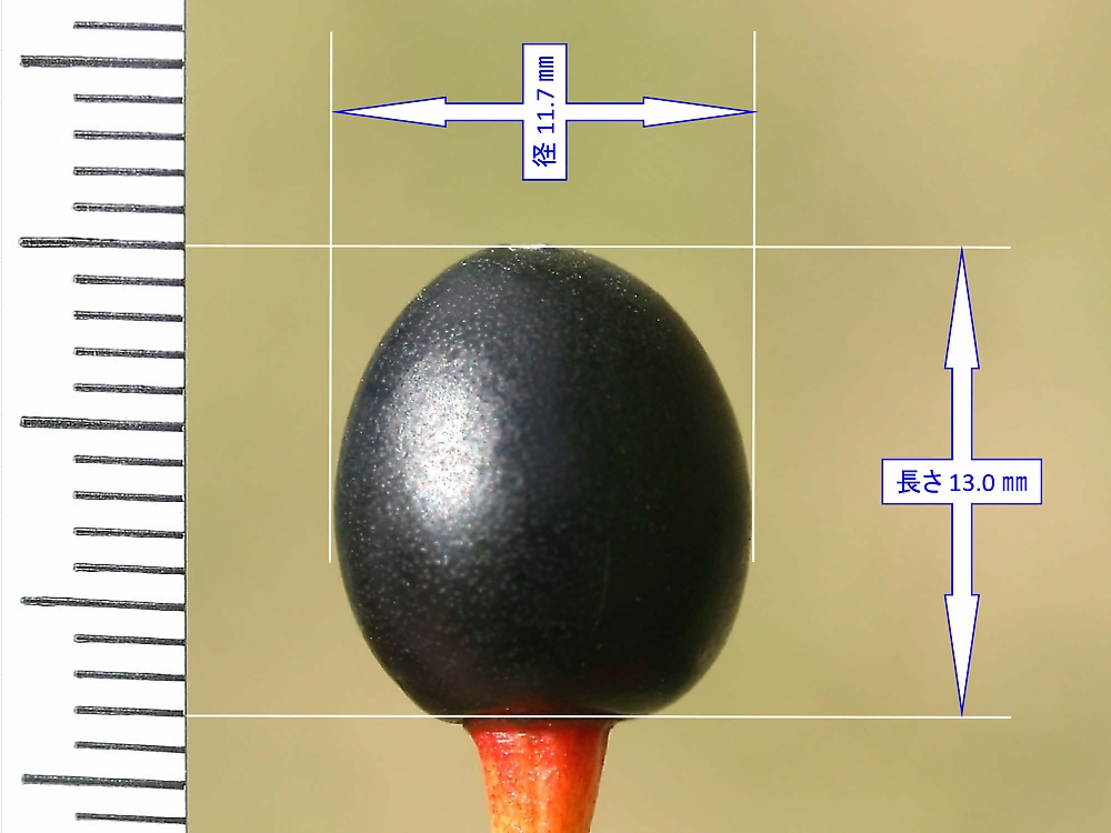 MEMO: 陽光の実の大きさで、長さが 13.0 ㎜で、径が 11.7 ㎜ (長さの90%)と、ほぼ球形で、真っ黒に熟しており立派な完熟実である
