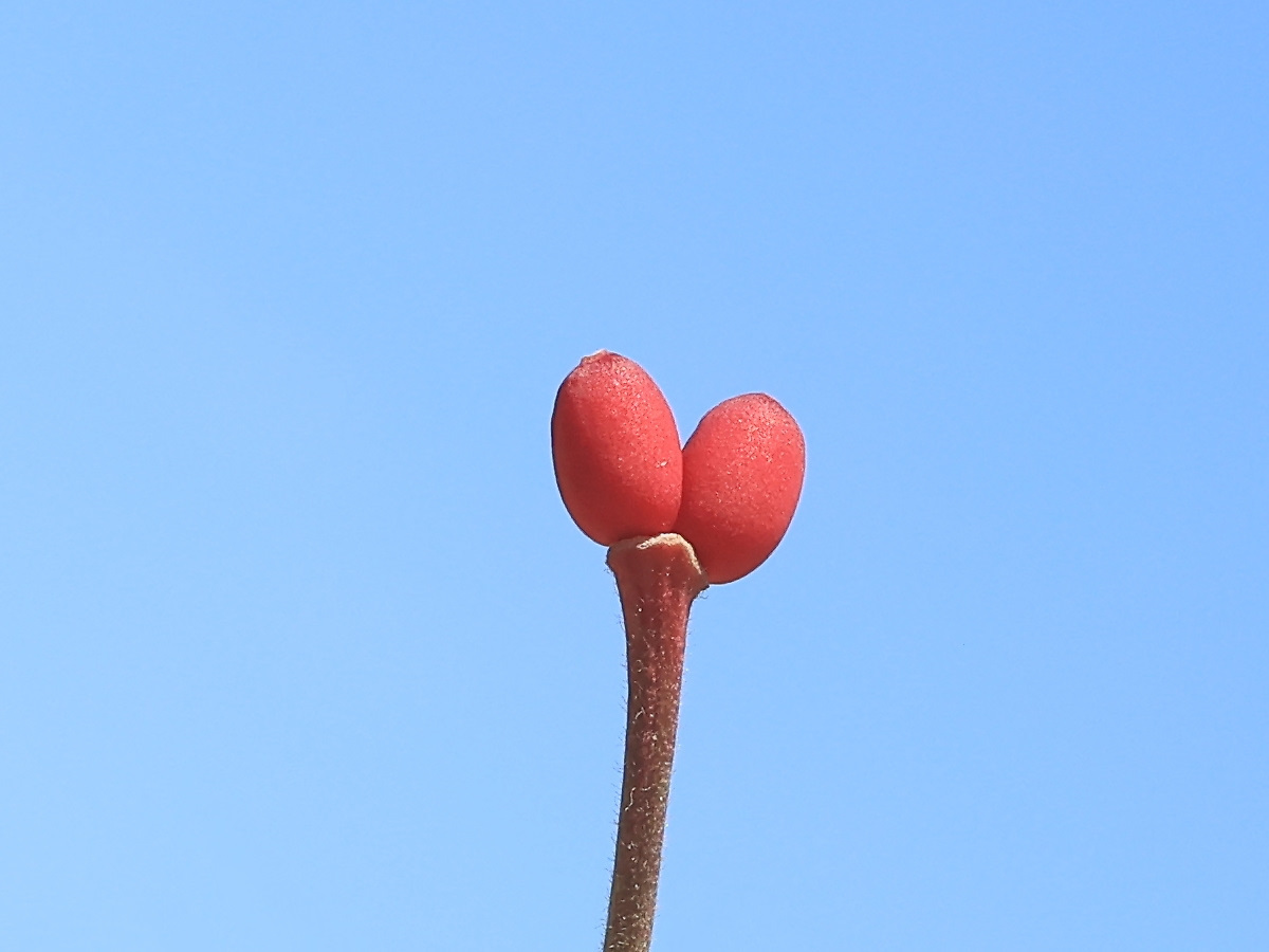MEMO: 結実したばかりのアーコレードの実で、双子の実で、 この大きさでもう真っ赤になっており、おそらく間もなく落果すると思われます