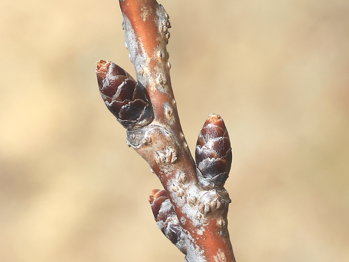 MEMO: 冬芽が膨らみ、先端が割れてかすかに紅色が見え始めている状態ですが、 このところの寒さで、10日前とほとんど変わっていない状況です