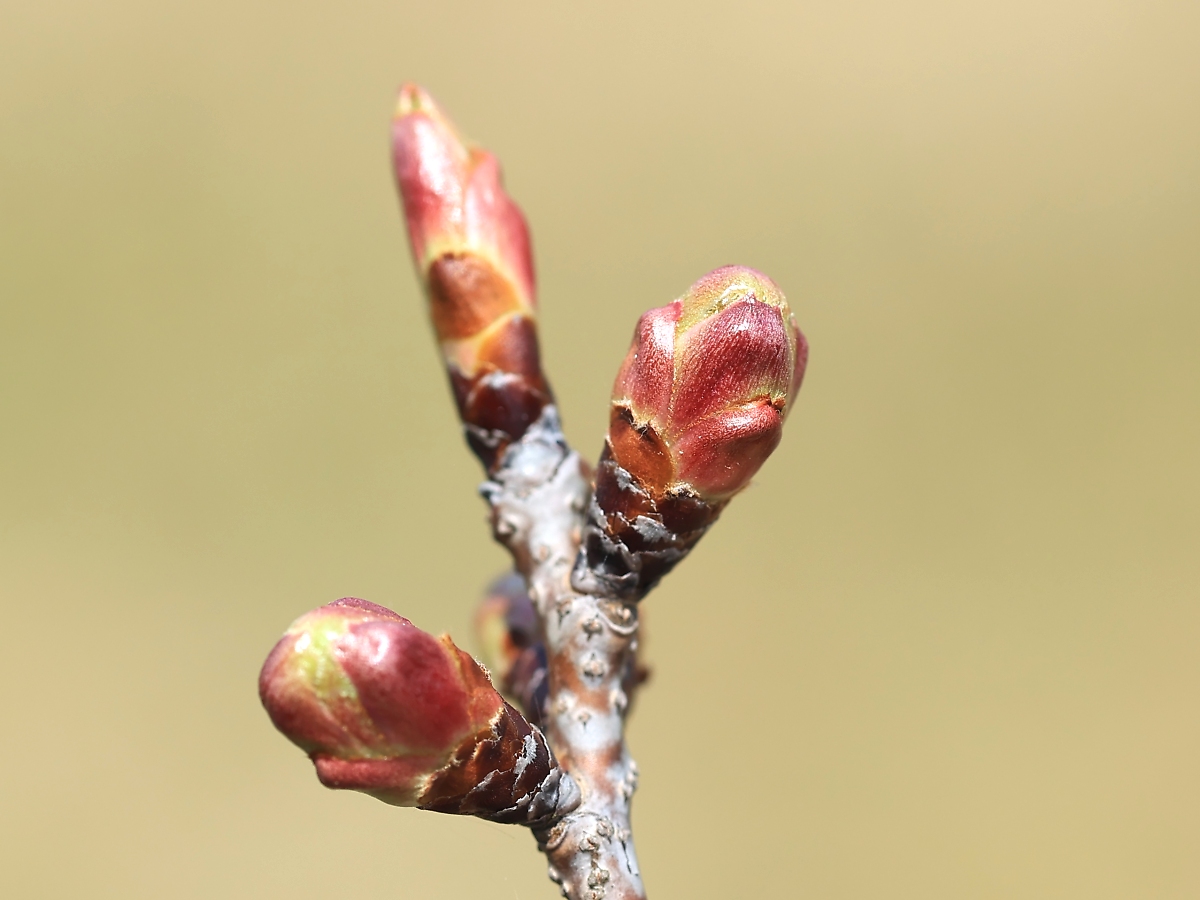 MEMO: 左右のふっくらとした冬芽は花芽で、花芽の膨らみが更に増し、 先端が割れ始めており、蕾が出るのが近づいてきた状態です