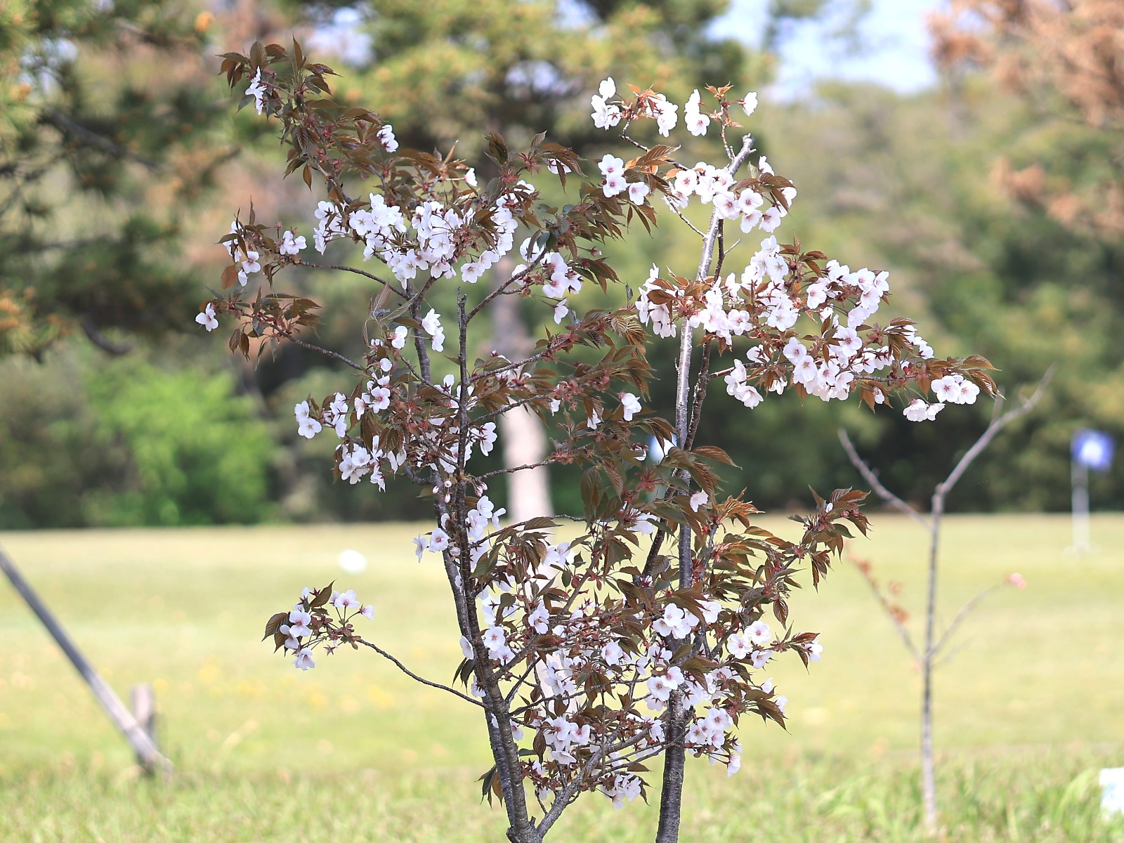 MEMO: 満開時期を迎えた嵐山の全体象ですが、植栽8年目の若木ですので、 見ての通り、木はあまり成長しておらず、花もまばらで華やかさはありません