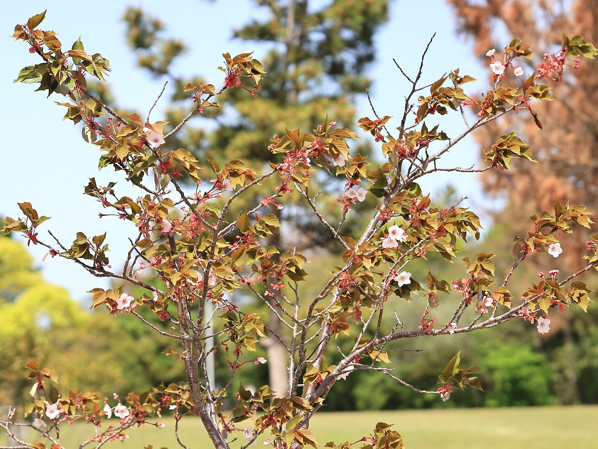 MEMO: 花時期も終リを迎えた嵐山の全体象で、 茶色の葉が広がっており、葉桜へと変わりゆく姿です