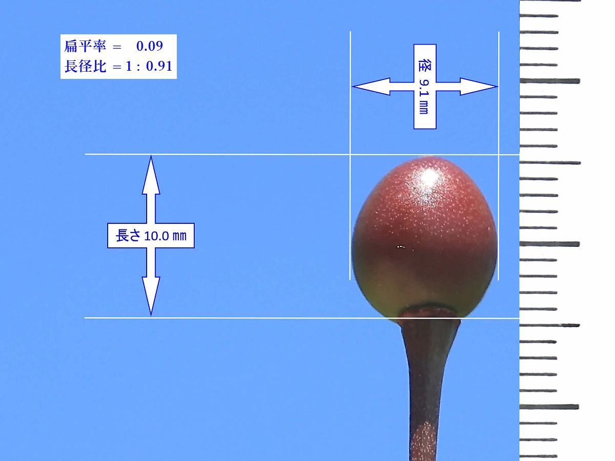MEMO: 結実から1週間から10日後の嵐山の実の大きさを計ったもので、 長さが 10.0 ㎜で、径が 9.1 ㎜で扁平率も 0.09 とほぼ球形に近い形と なって、色も赤くなってきており、完熟するまで見られるかが楽しみです