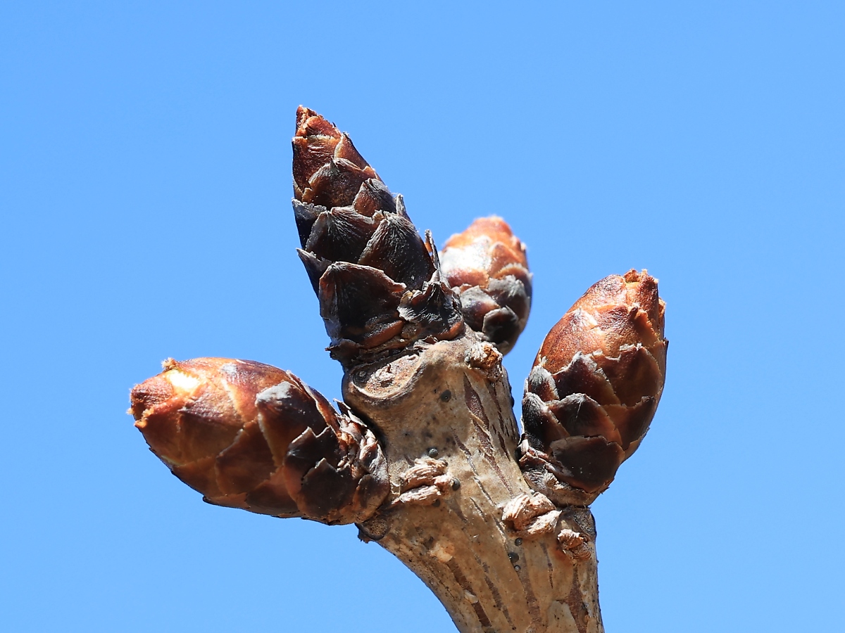 MEMO: 冬芽の膨らみが増し、先端が割れ、黄緑色が見え始めた状態ですが、 ここにきて3月の気温が低く推移したため、ほとんど成長していない状況です