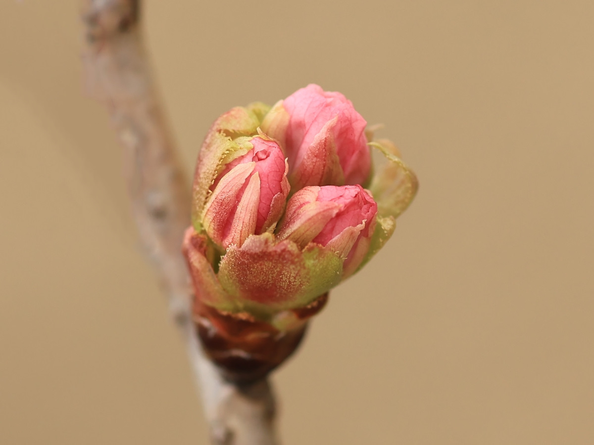 MEMO: 花芽の膨らみが増し、先端が割れ、中から蕾が3個顔を出したところで、 蕾ので初めからこのように紅色の花弁も見えており、花の咲くのがとても楽しみです