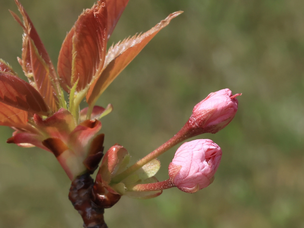 MEMO: 花芽から2個の蕾が出揃い、紅色の花弁の先端が開き始めており、 開花が近い状態で、横には茶色の若葉も開き始めています