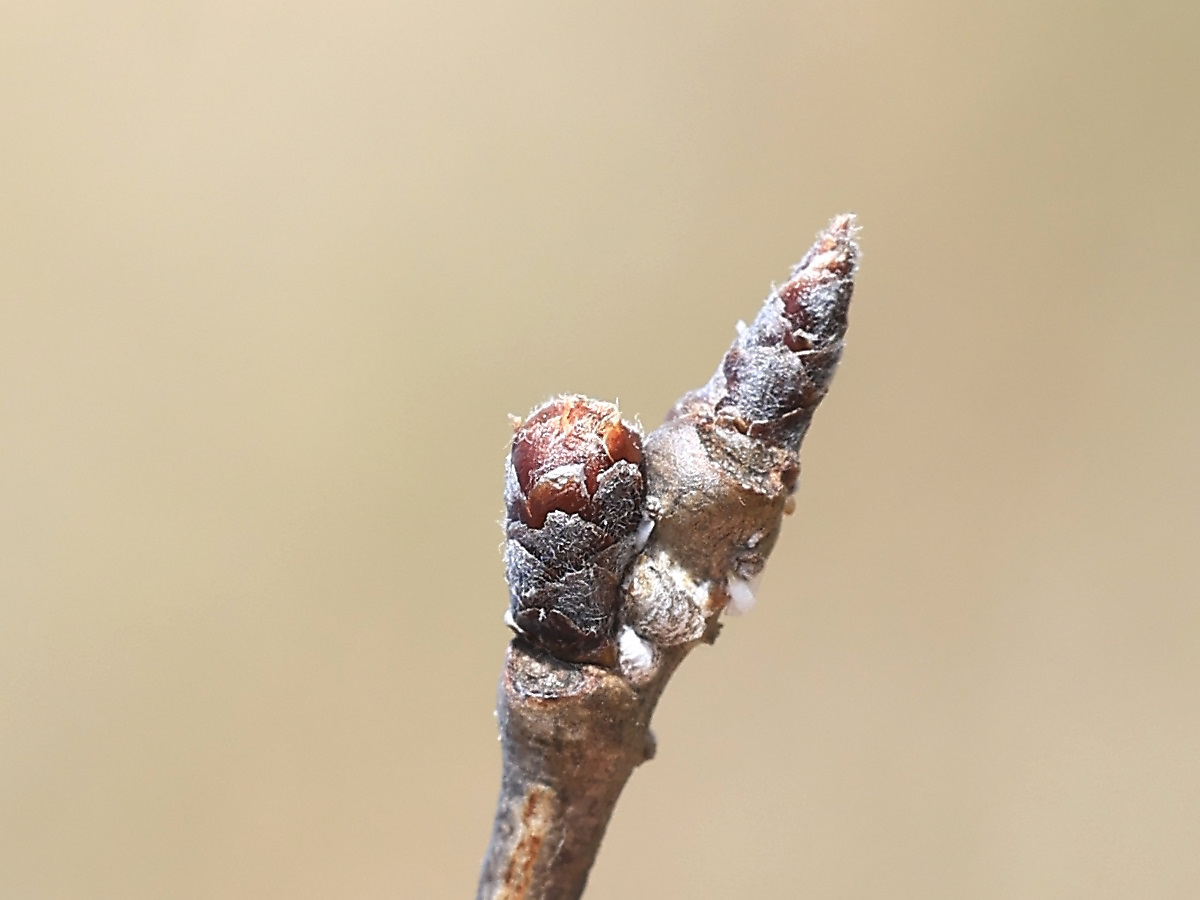 MEMO: 2月中旬の4月並みの高気温により、冬芽が少し膨らみ、 先端が割れてきたようで、例年よりかなり早く膨らみ始めたようです