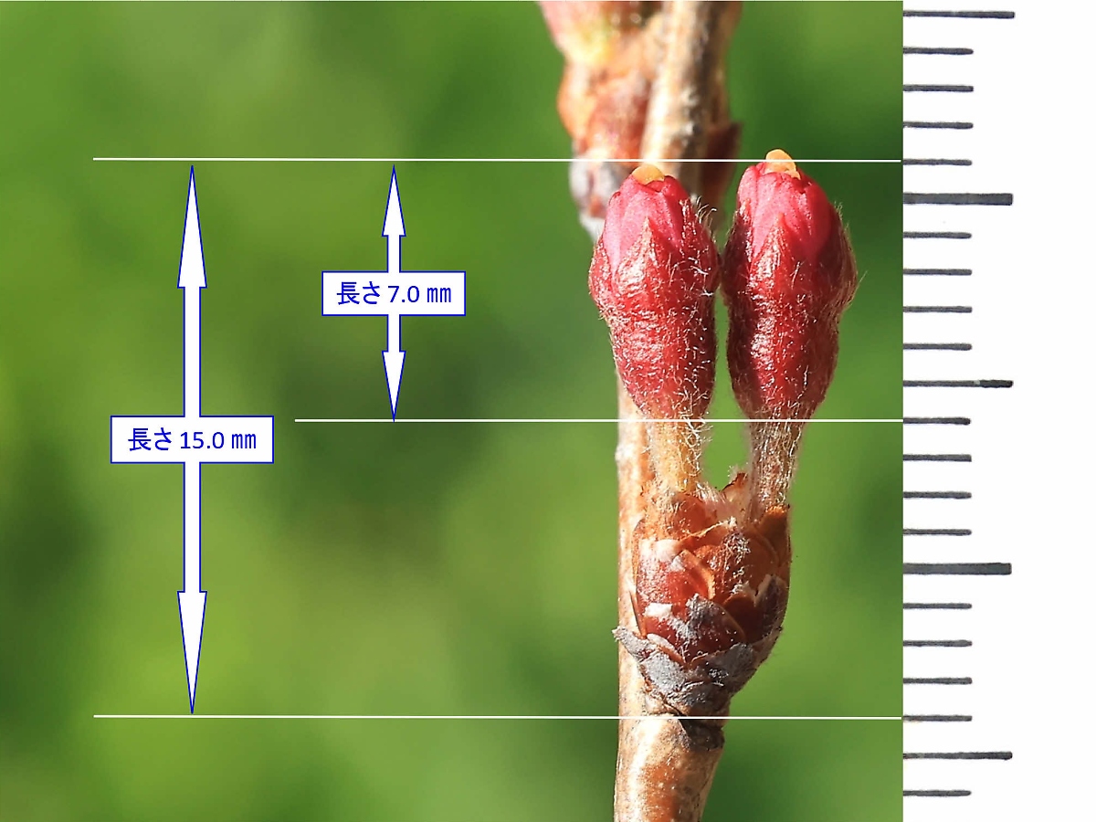 MEMO: 蕾が出揃った八重紅枝垂の蕾の長さを計ったもので、全体の 長さは 15 ㎜で、蕾の部分は 7 ㎜しかなく、桜の蕾の中でも最も小さい部類です