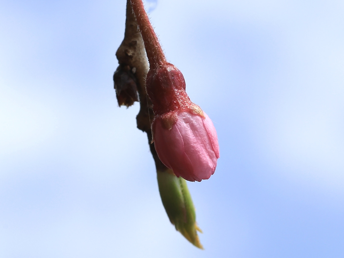 MEMO: 開花間近の八重紅枝垂の蕾で、蕾から出た紅色の花弁が 膨らんできており、後2~3日で開花すると思われる状態です