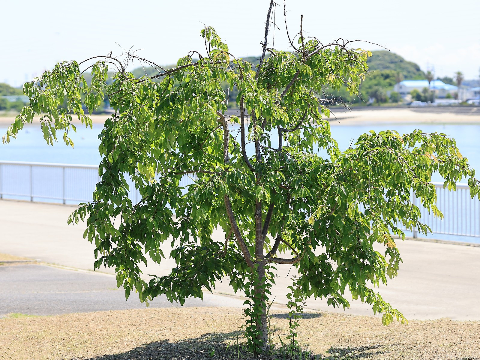 MEMO: 植栽9年目の八重紅枝垂で、樹形は枝垂れ状で、 樹高は 2.5 mで、樹頂が枯れて樹高が少し低いが、 枝張りは 4.3 mと植栽9年目としては順調に成長している状態です