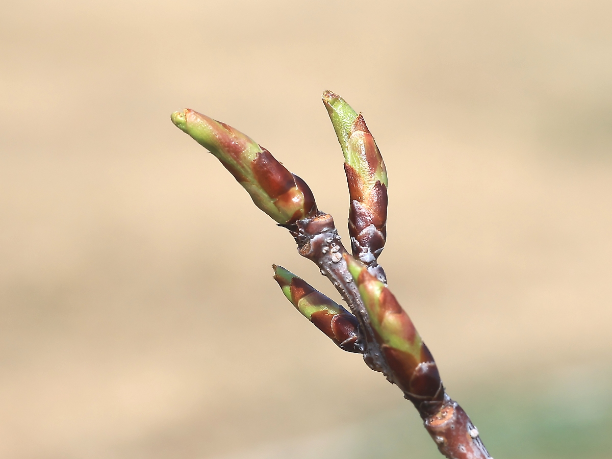 MEMO: 2月中旬の4月並みの高気温により、一気に冬芽の膨らみが増し、 先端が割れ葉が出てくるのが間近の状態で、この冬芽は全て葉芽と思われます