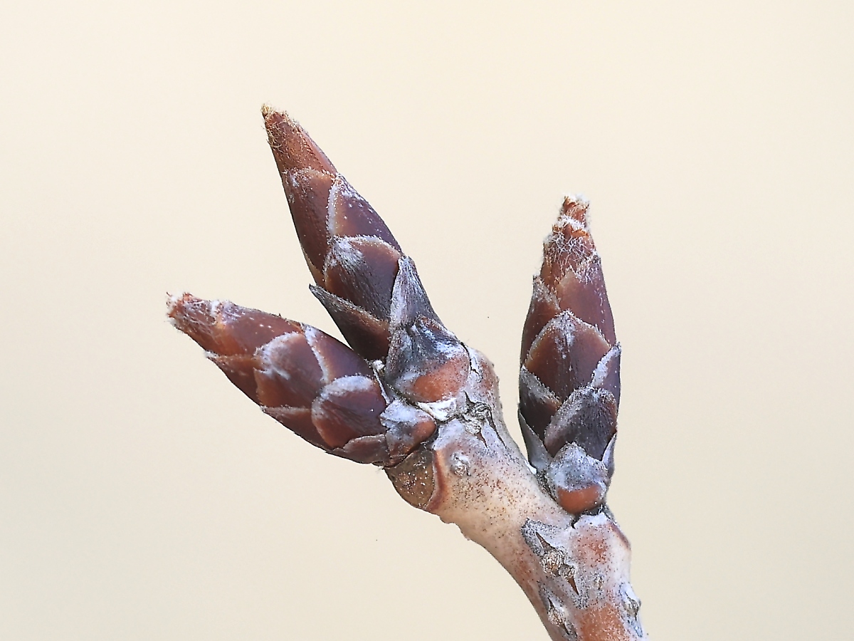 MEMO: 2月中旬の4月並みの高気温により、冬芽が膨らみ始めたようで、 冬芽が長くなり、先端がわずかに割れ始めている状態です