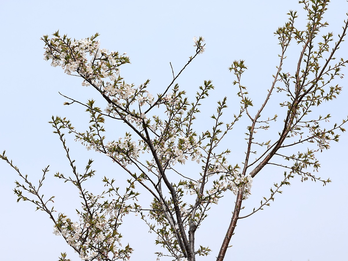 MEMO: 5分咲きの大島桜で、大島桜は蕾と若葉がほぼ同時に出ますので、 開花して見頃を迎える頃には、このように花と葉が混在した姿となります