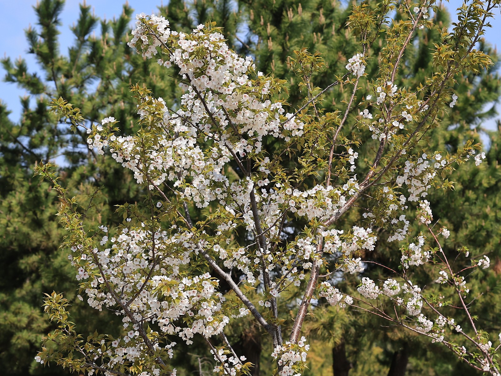MEMO: 満開時期を迎えた大島桜で、大島桜は蕾と若葉が ほぼ同時に出ますので、満開頃にはこのように黄緑色の若葉も かなり目立つようになり、花と葉が混在した姿となります