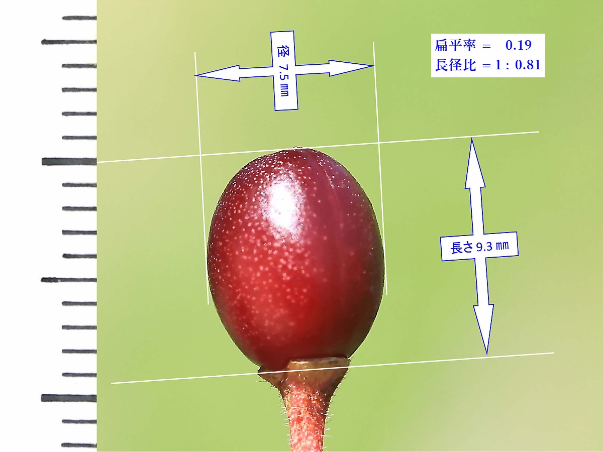 MEMO: 大島桜の結実約1カ月後の実の大きさを計ったもので、 長さが 9.3 ㎜、径が 7.5 ㎜で、扁平率も 0.19 と2週間前と ほとんど変わり無く、完熟はまだ少し先になりそうです