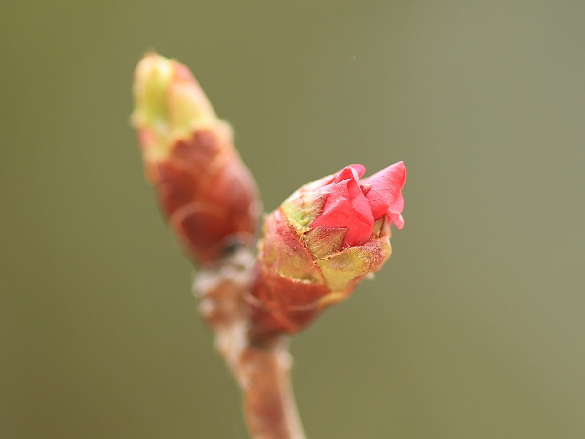 MEMO: 花芽の先端が割れ、先端から蕾が2個出始めたところで、 植栽9年目にして初めて見る蕾で、花芽からいきなり花弁が出ており、 どのようが花が咲くのか非常に興味が湧いてきています