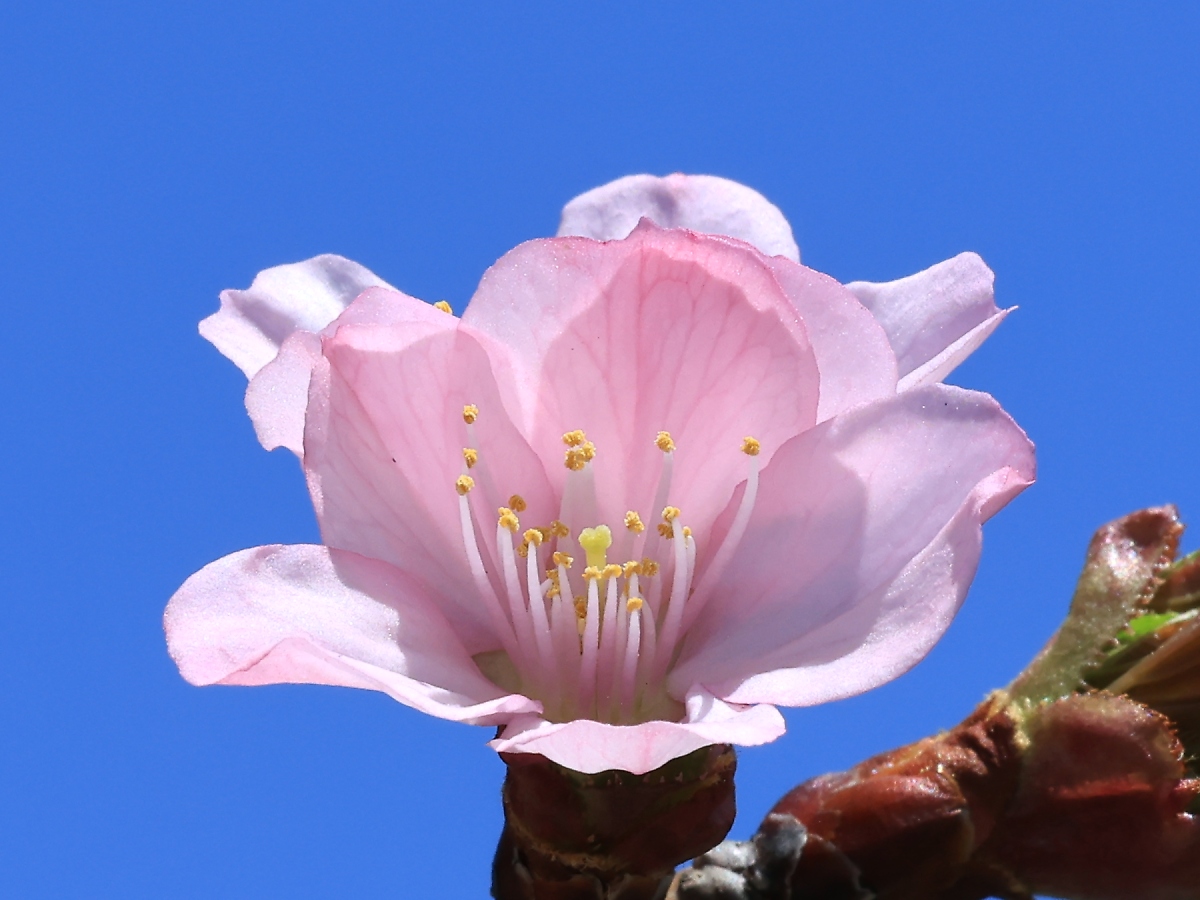 MEMO: 開花したばかりの大山桜で、一重咲きの中輪又は大輪で、 花は淡紅色から濃紅紫色と、変化にとんだ花を咲かせ、 植栽9年目にして初めて見る花で、花柄が短いのが大きな特徴です