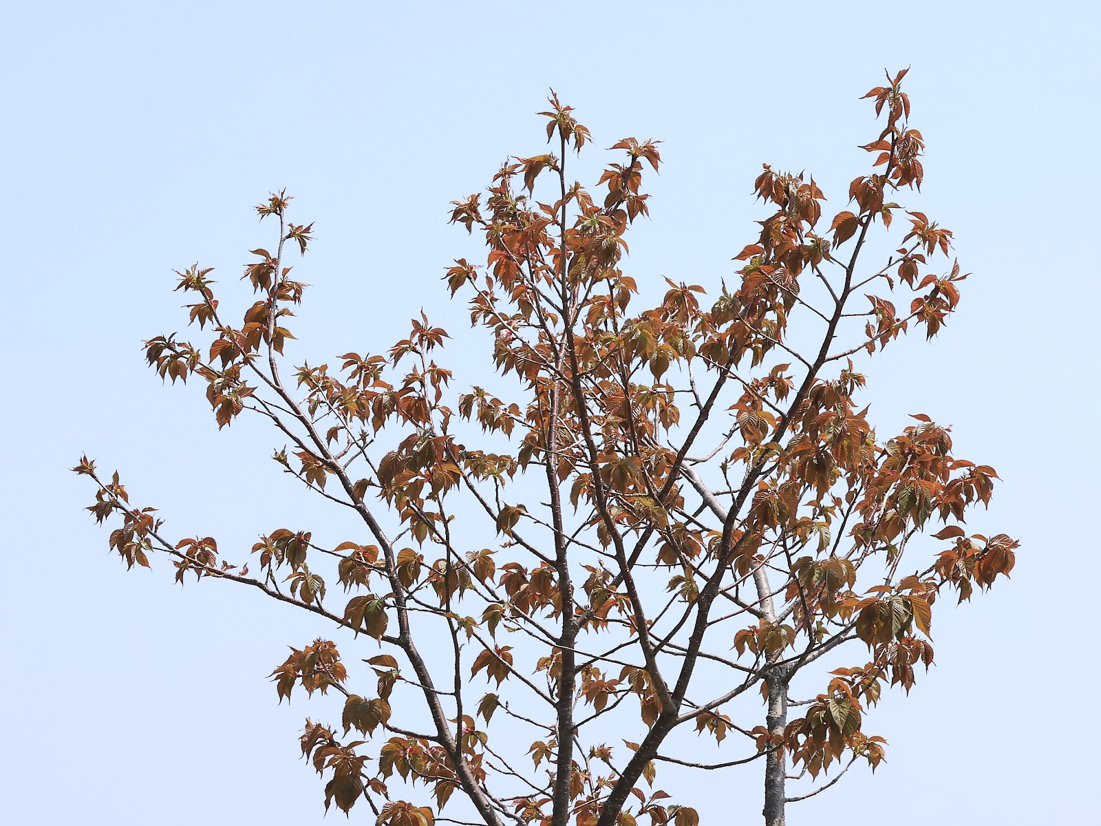 MEMO: 花時期の終りを迎えた大山桜の全体像で、赤銅色の若葉が開き始めており、 葉桜へと変わりつつある姿で、結局、花は3~4輪咲いただけで終わったしまいました