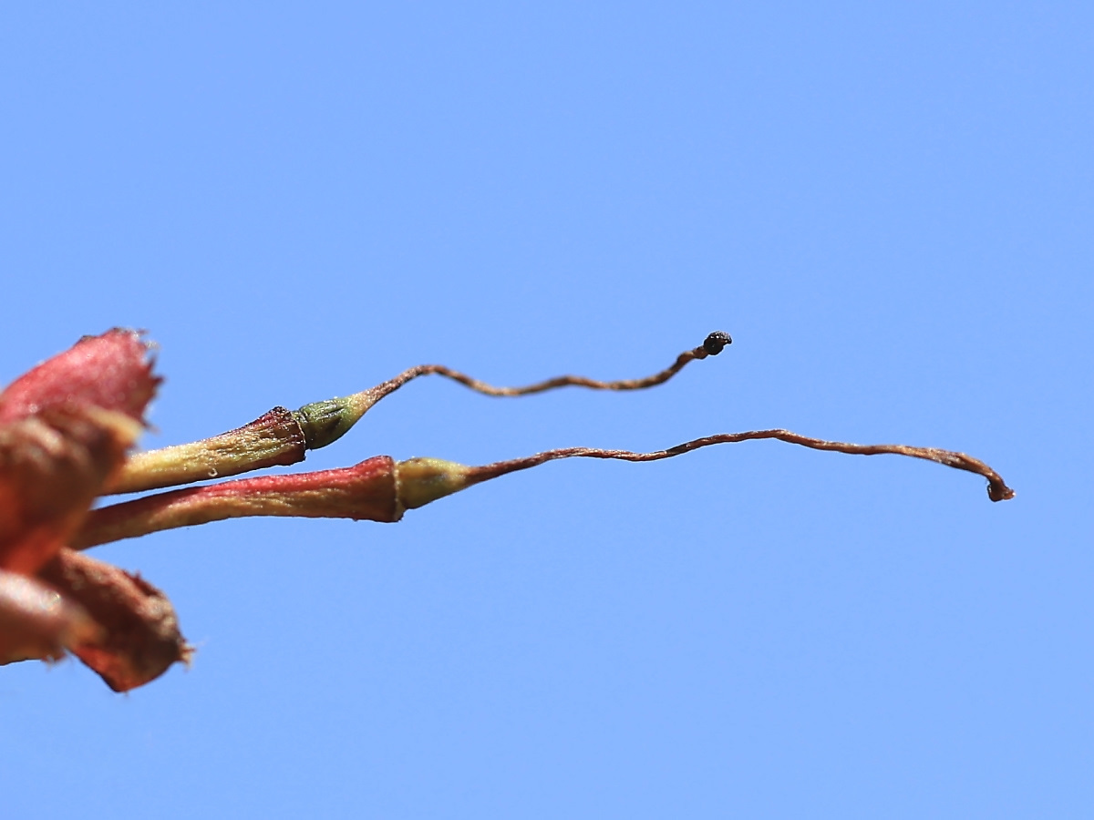 MEMO: 結実直後の大山桜の実ですが、上の実はしわが寄って萎れた感じがし、 下の実は黄色味がかっており、この実はその後まもなく落果してしまいました