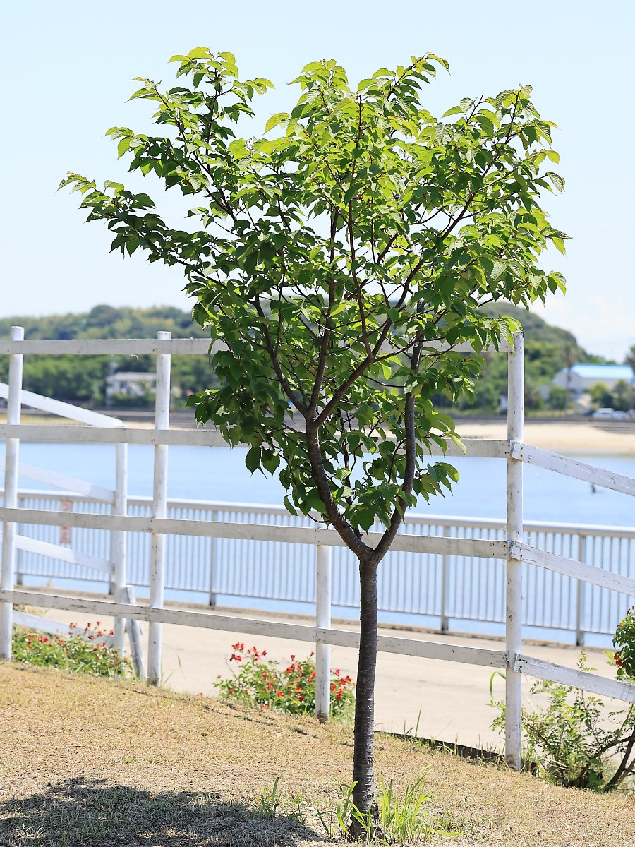 MEMO: 植栽9年目の大山桜で、樹形は広卵状ないし傘状で、樹高は 2.4 mと 植栽9年目にしてはやや成長が鈍く、今年やっと花が咲いた状態です