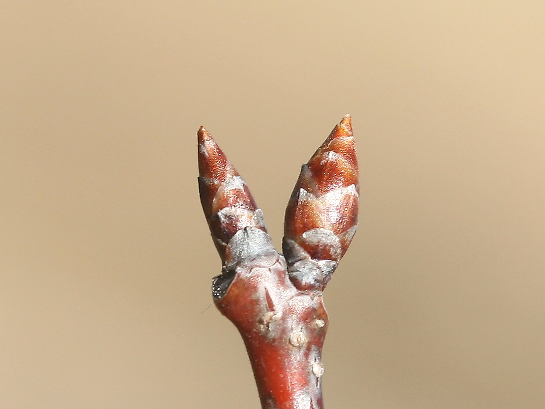 MEMO: オカメの冬芽で、右側の冬芽はやや膨らみが見えますが、 先端の色の変化が無いので、まだ膨らみ始めてはいないようです