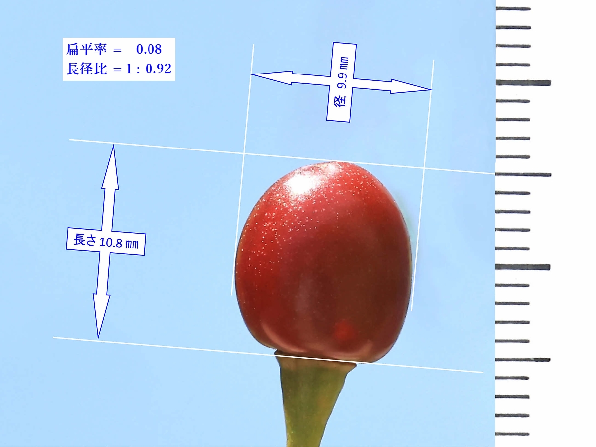 MEMO: オカメの結実約1ヶ月半後の実の大きさを計ったもので、 長さが 10.8 ㎜、径が 9.9 ㎜と一回り大きくなり、扁平率も 0.08 と ほぼ球形になり、色も真っ赤になり、完熟へと近づきつつある状態です