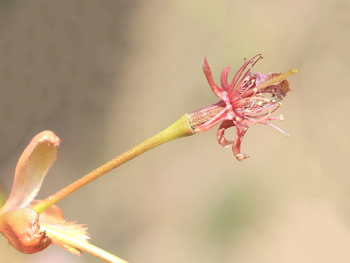 MEMO: 結実直後で、まだ、実を萼筒が覆っており、その先には萼と雌しべ 雄しべも萎れてはいますが、そのままの形で残っており、実はその2で見て下さい