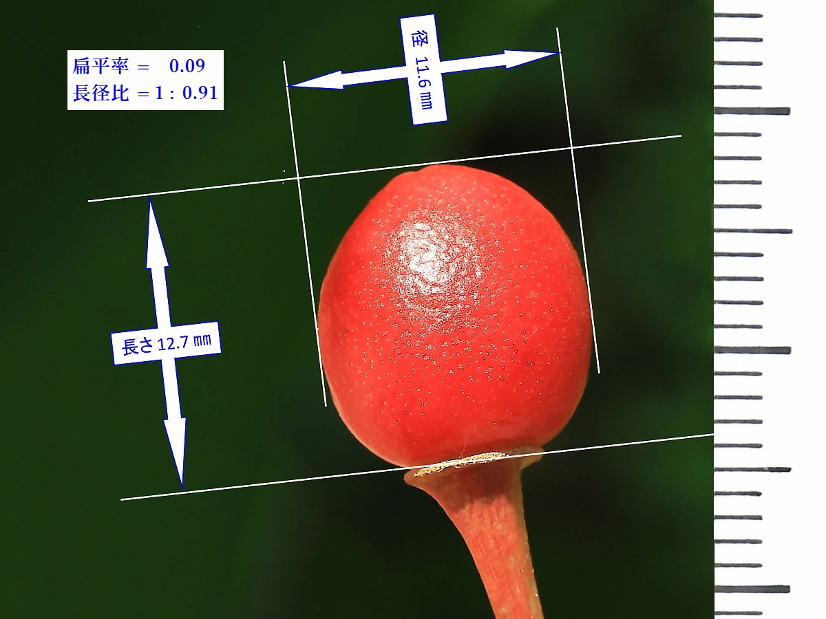 MEMO: 河津桜の結実約2ヶ月後の実で、長さが 12.7 ㎜で、径が 11.6 ㎜と 一回り大きくなり、扁平率も 0.09 と球形になり、色も真っ赤になってきた状態です