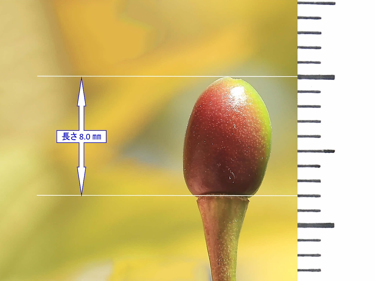 MEMO: 結実から約3週間後の寒桜の実の長さを計ったもので、 長さが 8.0 ㎜と大きくなり、陽の当たっている側は赤く色づいています