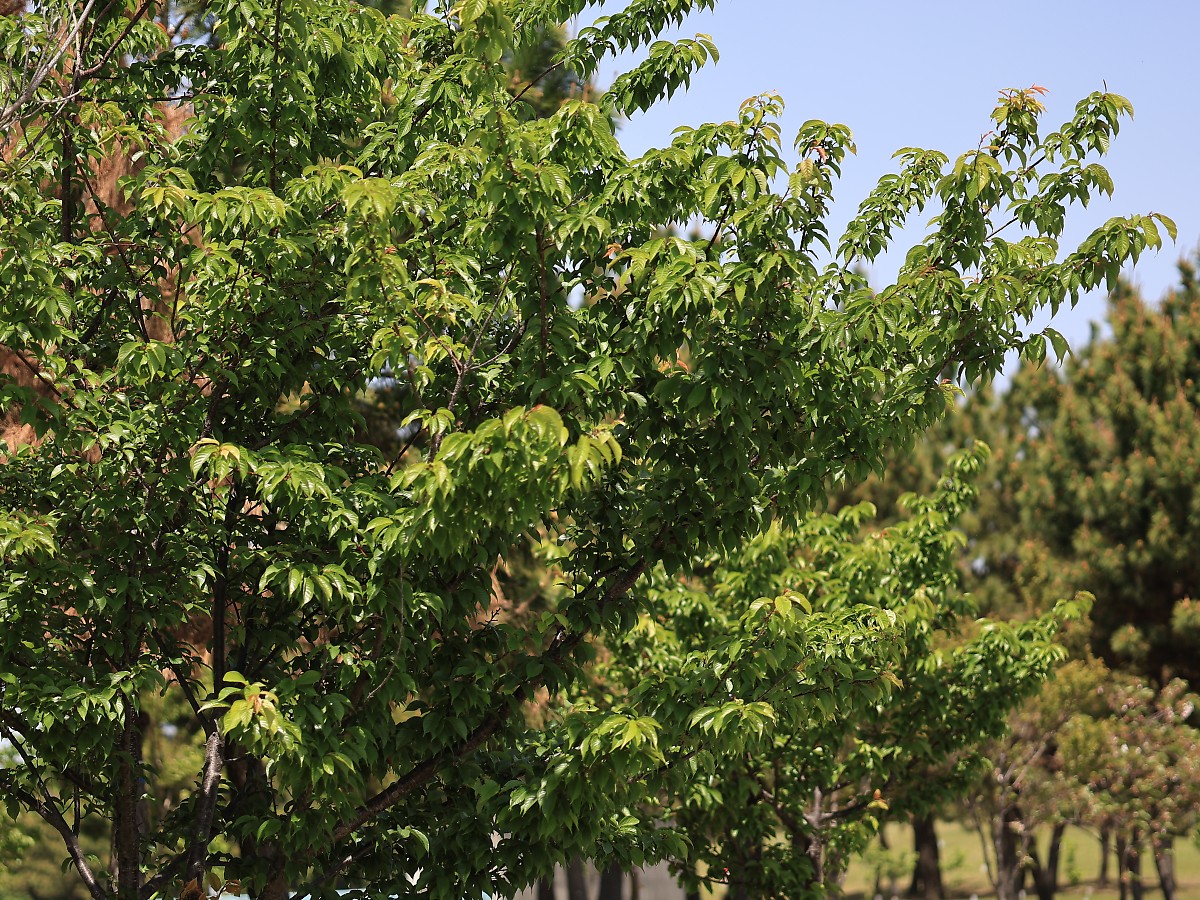 MEMO: 緑色の若葉が生い茂り、すっかり葉桜となった寒桜の全体像です