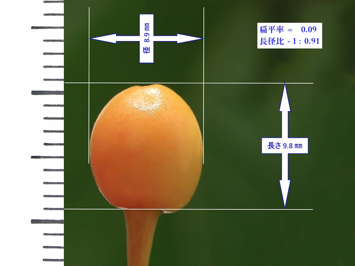 MEMO: 結実から約2ヶ月後の寒桜の実の大きさを計ったもので、 長さが 9.8 ㎜で、径が 8.9 ㎜で、扁平率が 0.09 とまん丸になり、 色も黄色になり、完熟といっても良い状態ですが、この先真っ黒になる予想です