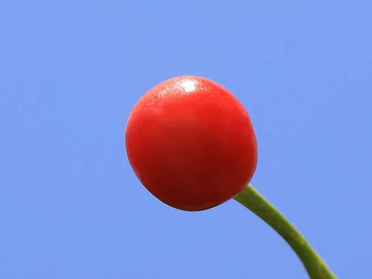 MEMO: 結実から約2ヶ月半後の寒桜の実ので、 真っ赤に色づいて、真ん丸で、完熟に向けて進んでいる状態です