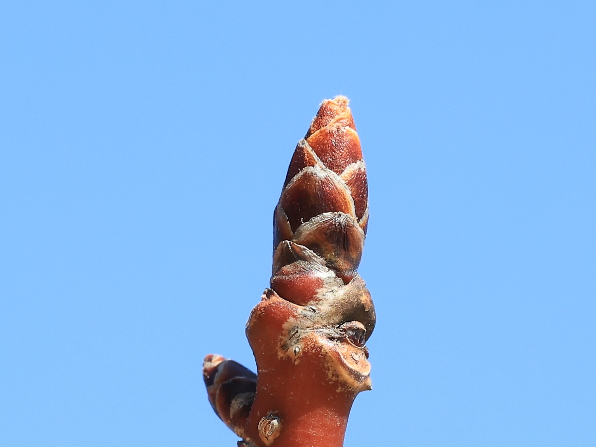 MEMO: 2月中旬の4月並みの高気温により、冬芽が 少し膨らみ始めたようで、先端が少し伸び始めています
