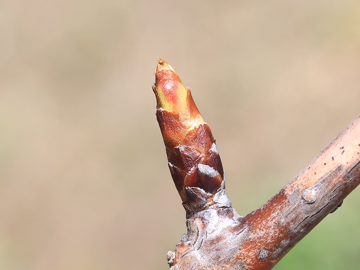 MEMO: 冬芽が長く伸び、膨らみが増して、先端が割れ、 黄緑色や紅色がはっきり見えるようになってきた状態です