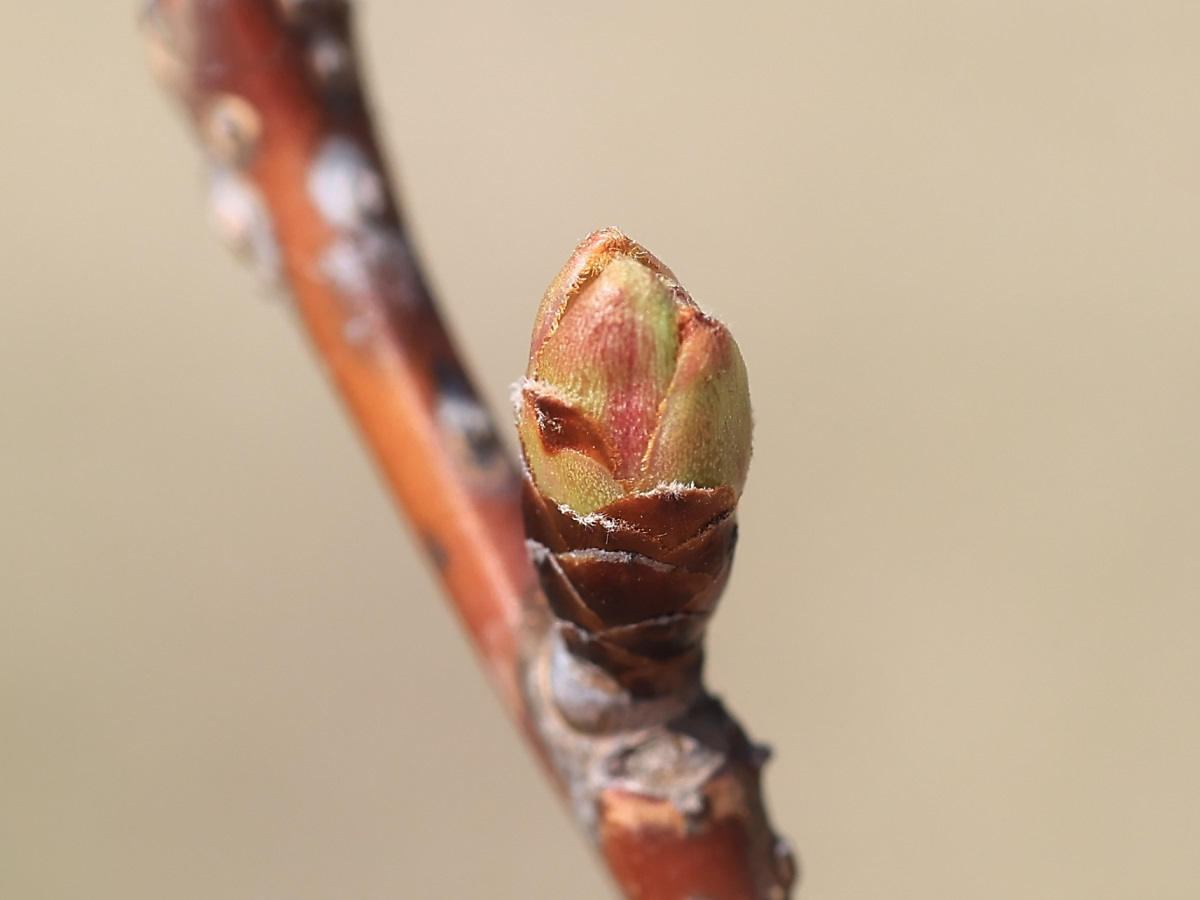 MEMO: 冬芽の膨らみが更に増して、先端に黄緑色や紅色がはっきり 見えており、これは花芽と思われるので、まもなく蕾が出始める状態です