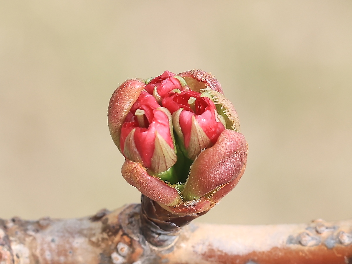 MEMO: 花芽の先端が割れ、中から蕾が2個出始めたところで、出始めから 紅色の花弁が開いており、中心には雌しべの先端が見えている状態です