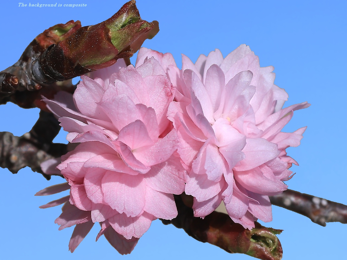 MEMO: 開花したばかりの菊枝垂で、菊咲きの大輪で、 花色は紅色で、咲き進むと花がまとまって咲くため、 とても豪華に見えますが、まだ、咲き始めなので豪華さはありません