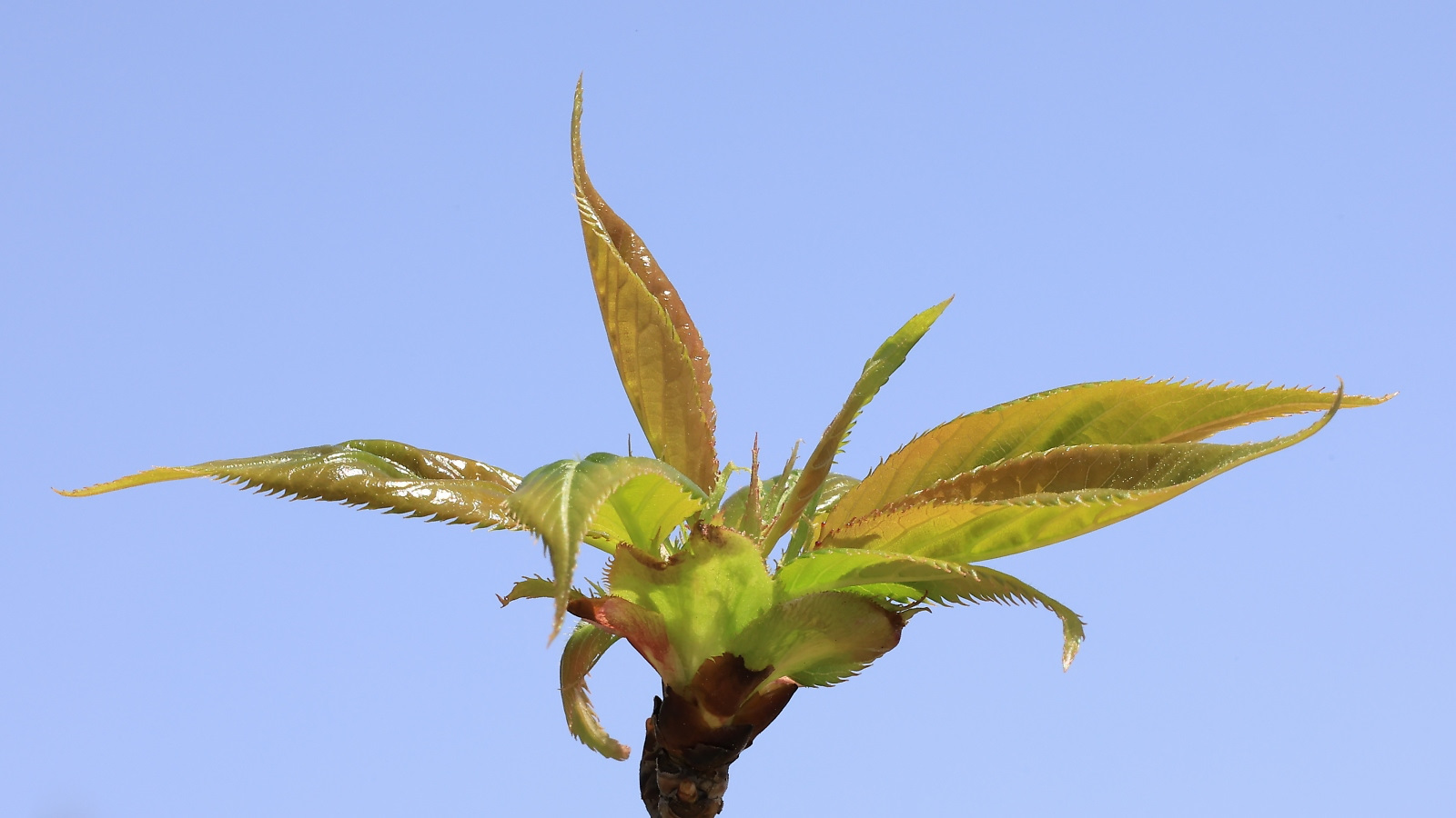 MEMO: 菊枝垂は満開時期を迎えた頃に、 このような茶色がっかた黄緑色の若葉が開き始めます