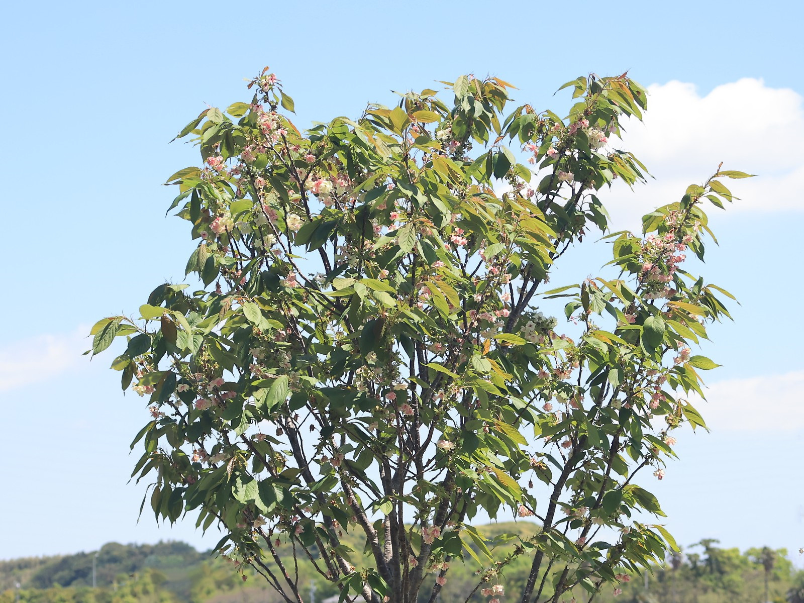 MEMO: 花時期も終了間近を迎えたの御衣黄の全体像で、 黄緑色の若葉が広がっており、花は紅色に変わって 見やすくなっているが、葉に埋もれて見栄えは無くなっている
