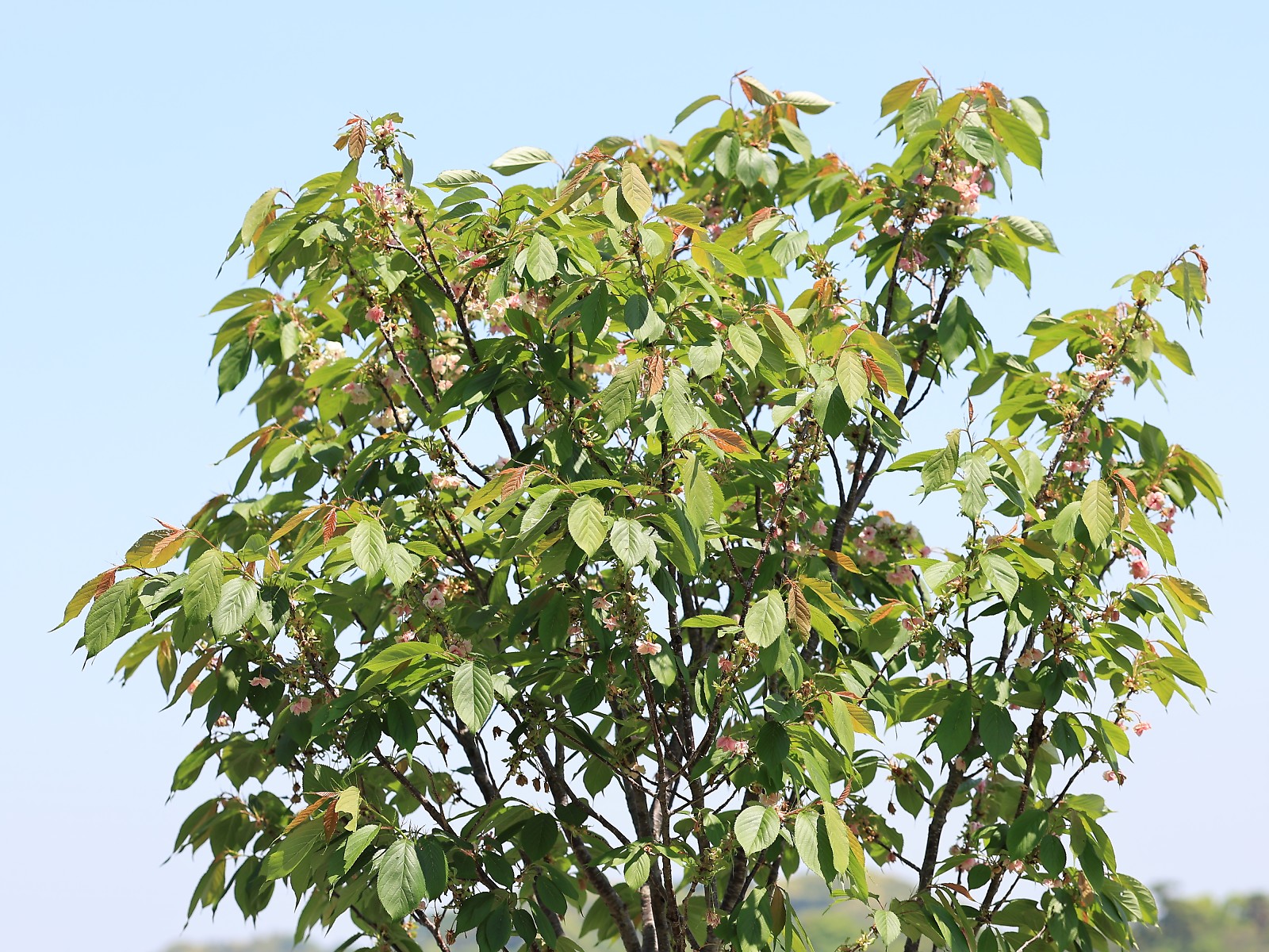 MEMO: 花時期も終わりを迎えたの御衣黄の全体像で、 黄緑色の若葉が広がって葉桜へと変わりつつある姿です