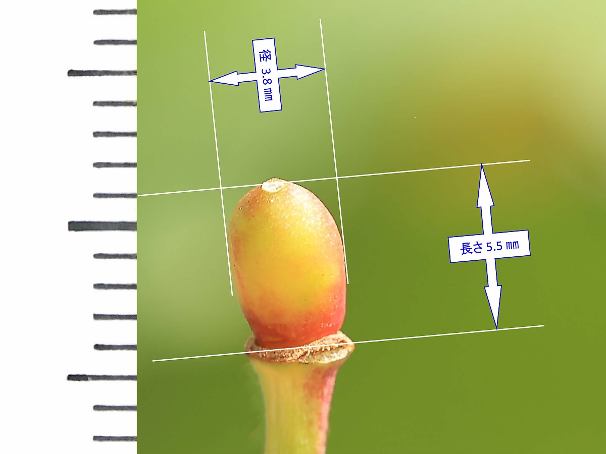 MEMO: 結実して10日前後経過した御衣黄の実の大きさを計ったもので、 長さが 5.5 ㎜で、径が 3.8 ㎜とほとんど成長しておらす、この大きさで実が 赤くなってきており、これ以上は大きくならずまもなく落果すると思われます