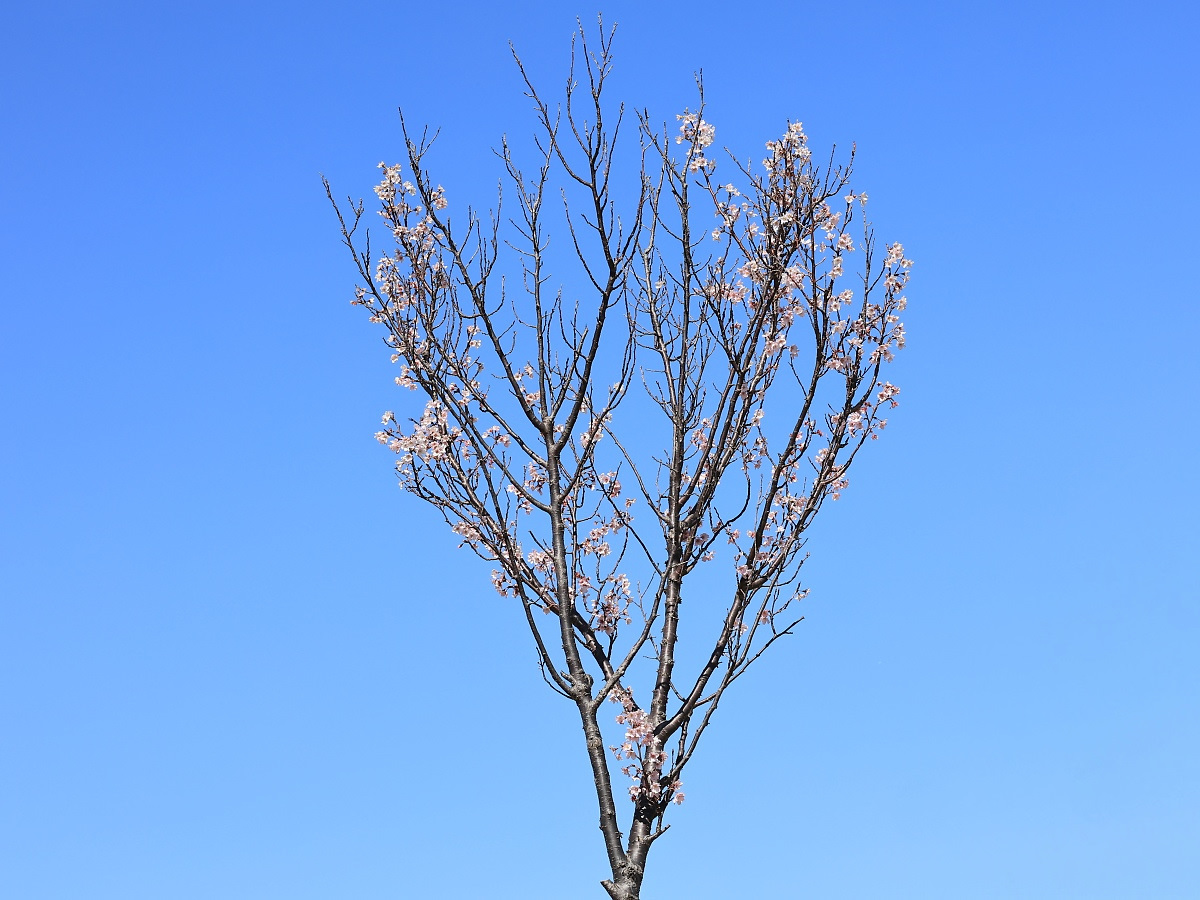 MEMO: 散り始め時期を迎えた敬翁桜ですが、この通り木全体に花は付いておらず、 花付きの良い啓翁桜ですが、年々木の傷みが激しくなり、このような状態です