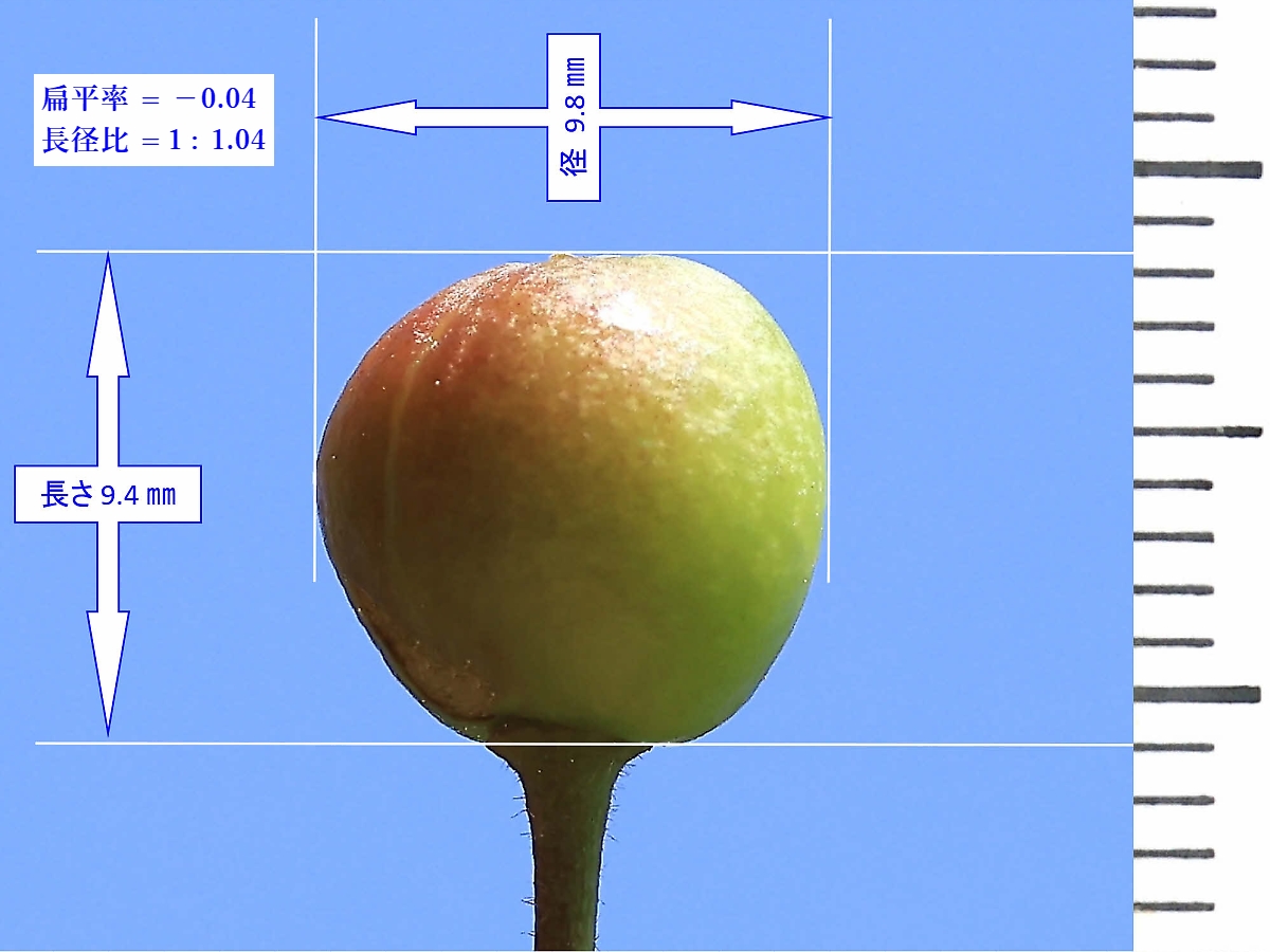 MEMO: 結実して約4週間後の啓翁桜の実の大きさを計ったもので、 長さが 9.4 ㎜で、径が 9.8 ㎜で、扁平率が -0.04 と、長さより径の方が 大きくなり、啓翁桜の実の特徴で、この状態で完全な球形をしています