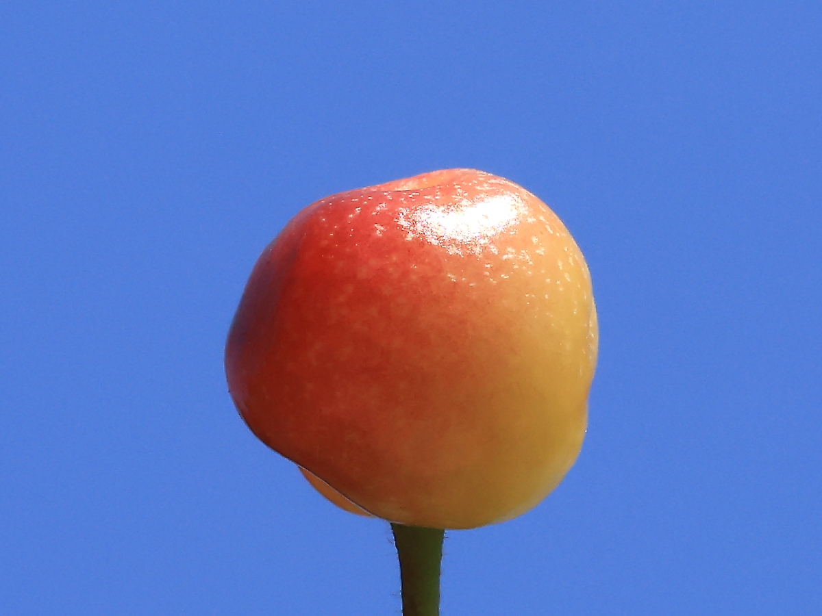 MEMO: 結実して約4週間後の啓翁桜の実で、少々形がいびつですが、 色が黄色味を帯びた赤色で、ほぼ完熟の状態で、虫にかじられており、 おそらくこれ以上は熟さず、まもなく落果すると思われます