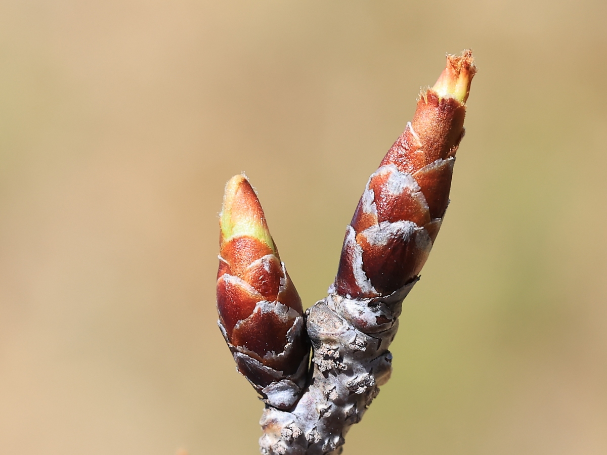 MEMO: 冬芽が膨らみ、先端の黄緑色や紅色がはっきり見える状態ですが、 まだ、この状態では2つの冬芽が花芽か葉芽かは判断できません
